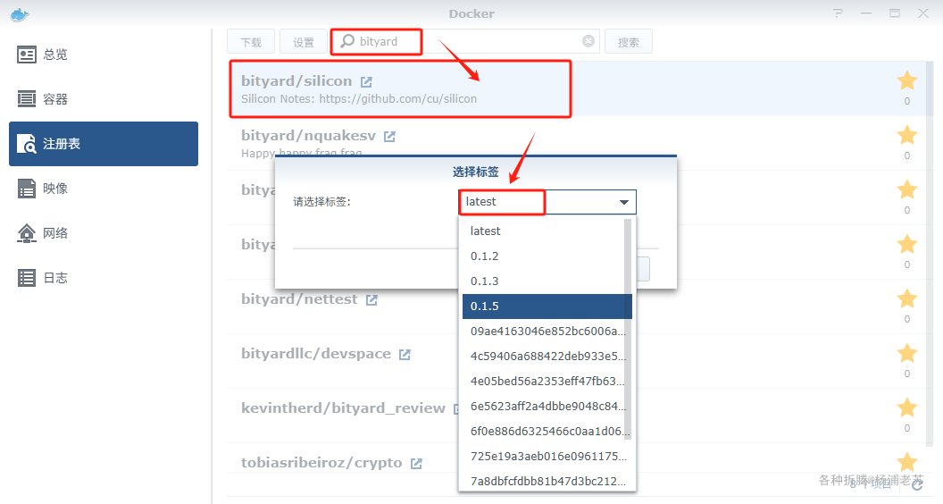 在注册表中搜索 bityard ,选择第一个 bityard/silicon,版本选择 latest。