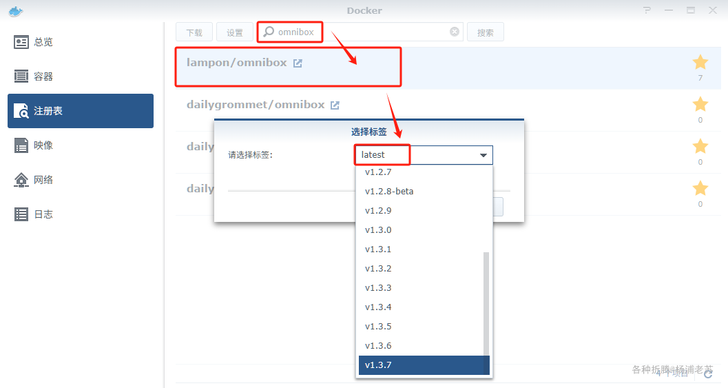 在注册表中搜索 omnibox ,选择第一个 lampon/omnibox,版本选择 latest。