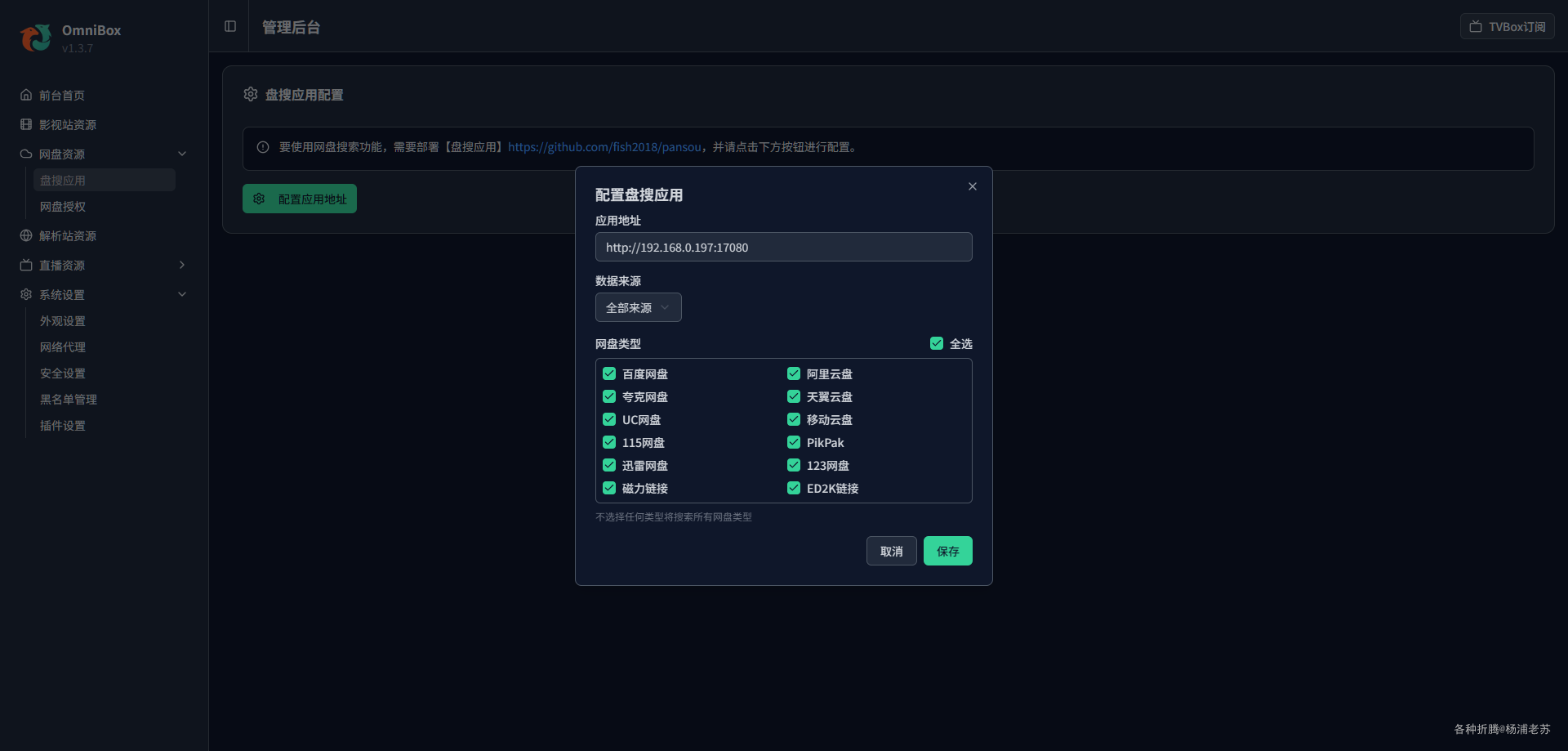 pansou的地址,例如:http://192.168.0.197:17080 - 网盘类型:全选