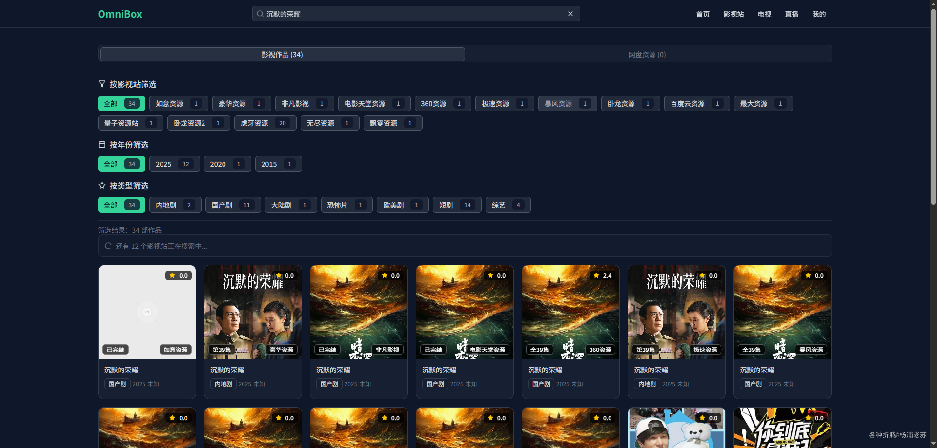 OmniBox是一个功能强大的影视综合站,解决了资源分散、查找困难的问题,为影视爱好者提供一站式的观影解决方案。它整合了常见的采集站、网盘资源、IPTV直播源、各大直播平台等,无论您是付费会员、还是习惯于搜索免费资源,它都能满足您的需求。