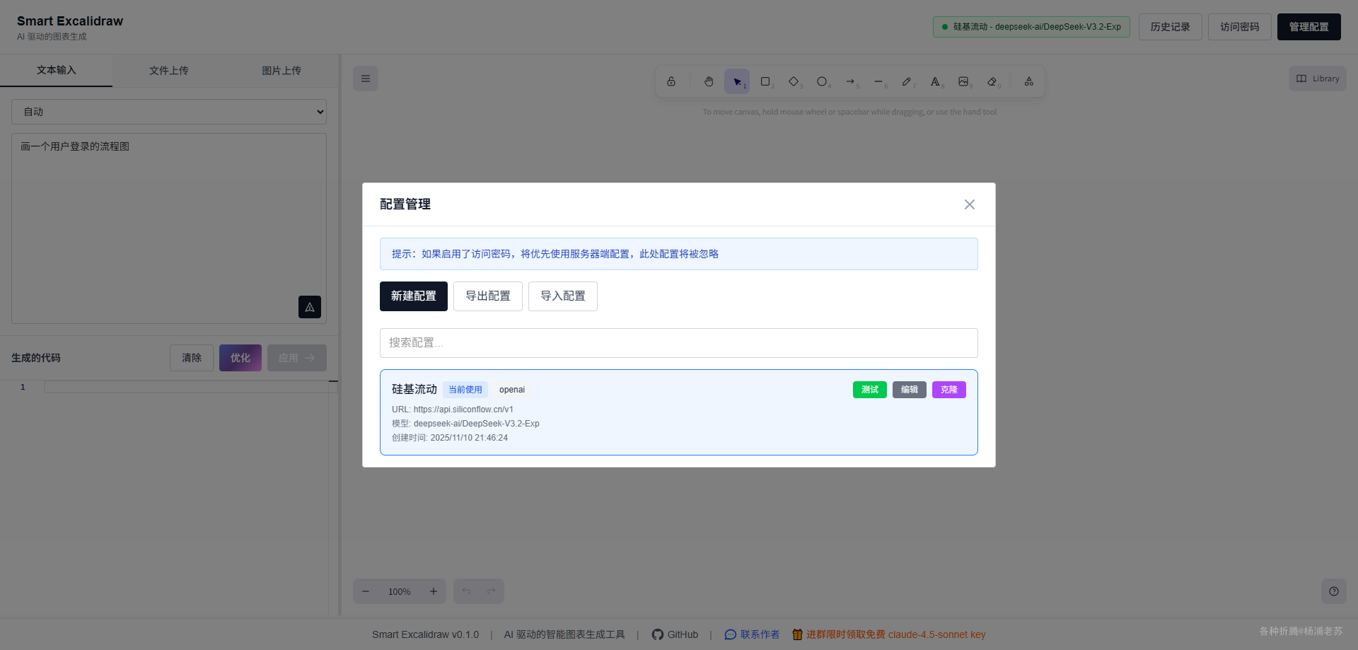 AI生成的图表都完全兼容Excalidraw,你可以在画布上随时进行二次创作,自由编辑、调整样式或添加更多细节。 - ⚡开箱即用与隐私安全:只需在前端配置你的