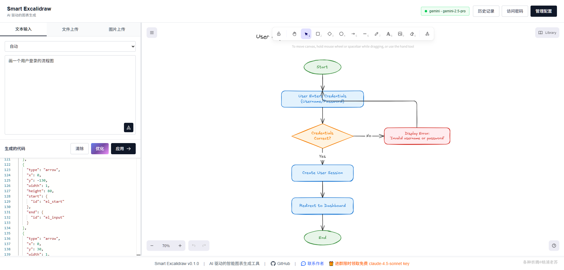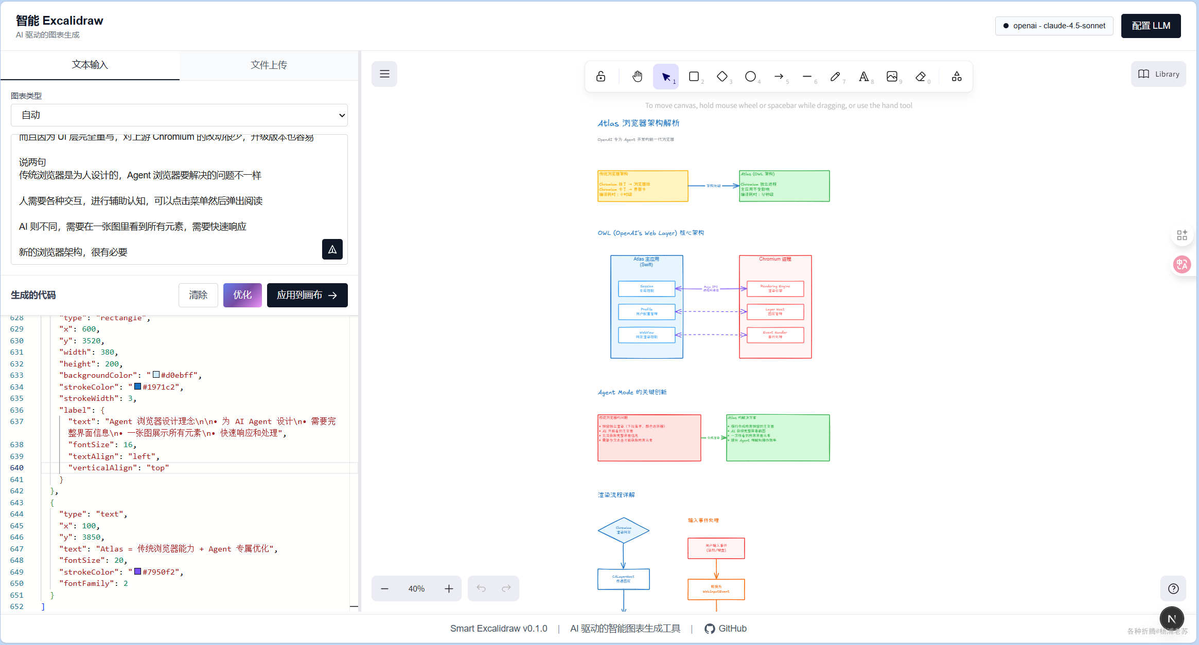 LLM),能深刻理解用户需求,将文字描述转化为结构清晰、布局合理的专业图表。 - 🔗智能连接算法:采用独创的智能箭头优化算法,自动计算元素间的最佳连接点,确保图表线条流畅、逻辑清晰,告别手动调整的烦恼。