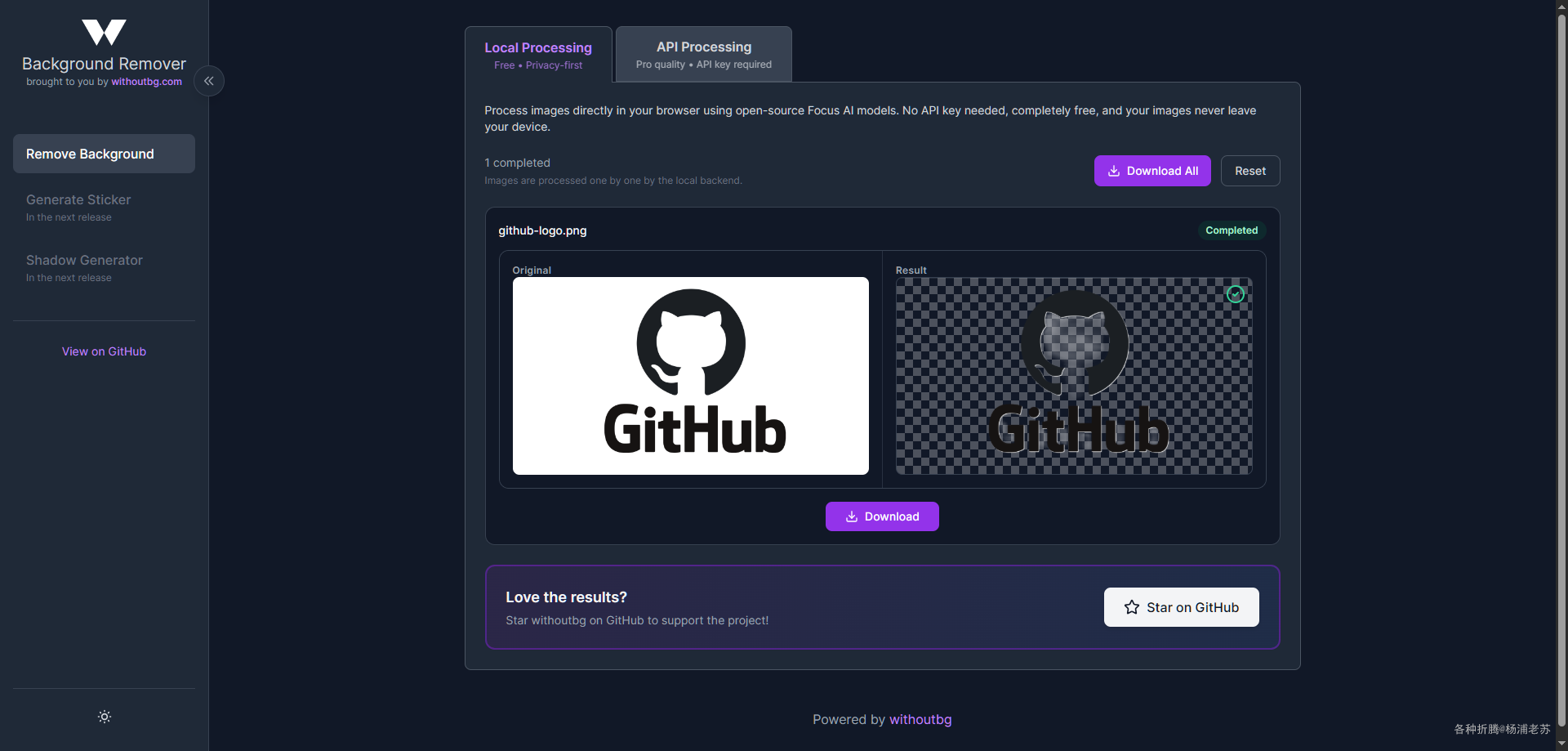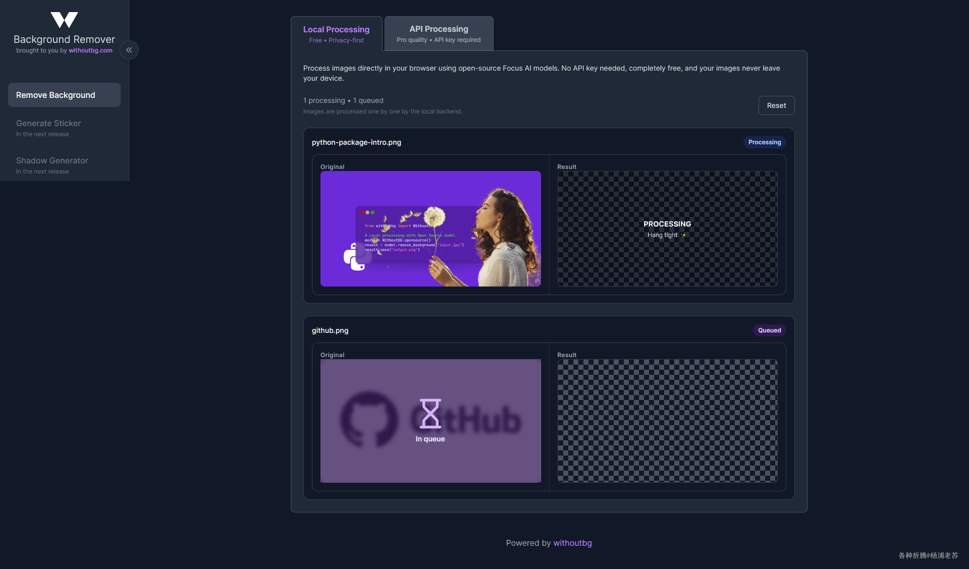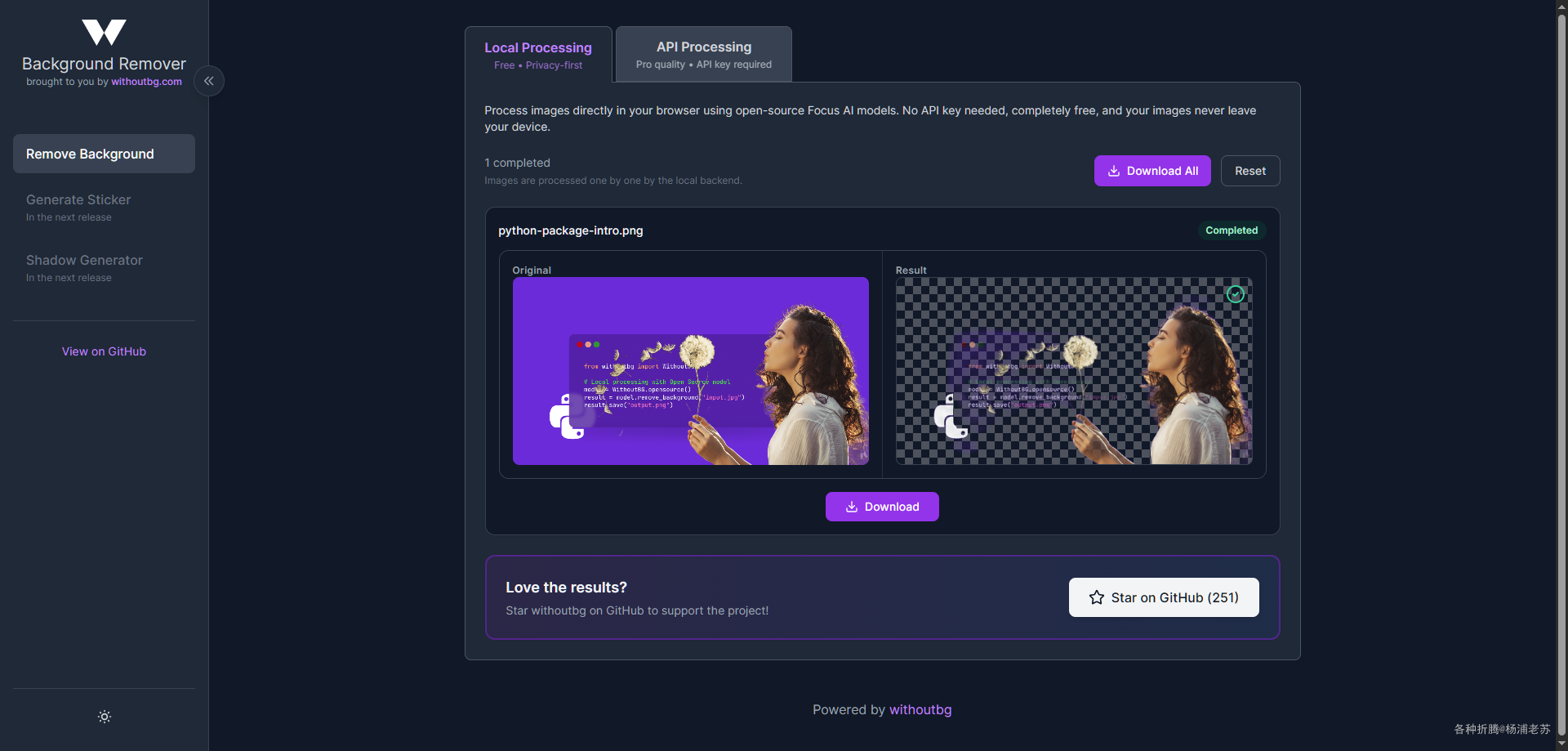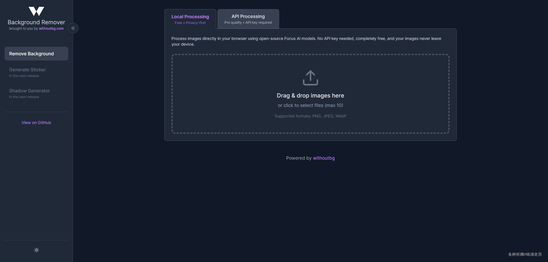 - 云处理(withoutBG Pro): 提供更高质量的输出,适用于商业用途,也提供免费套餐。