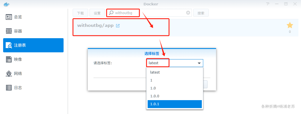 在注册表中搜索 withoutbg ,选择 withoutbg/app,版本选择 latest。