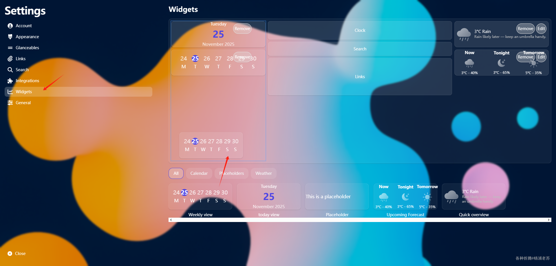 右下角进入 Settings –> Widgets,可以通过拖拽对主界面进行编排