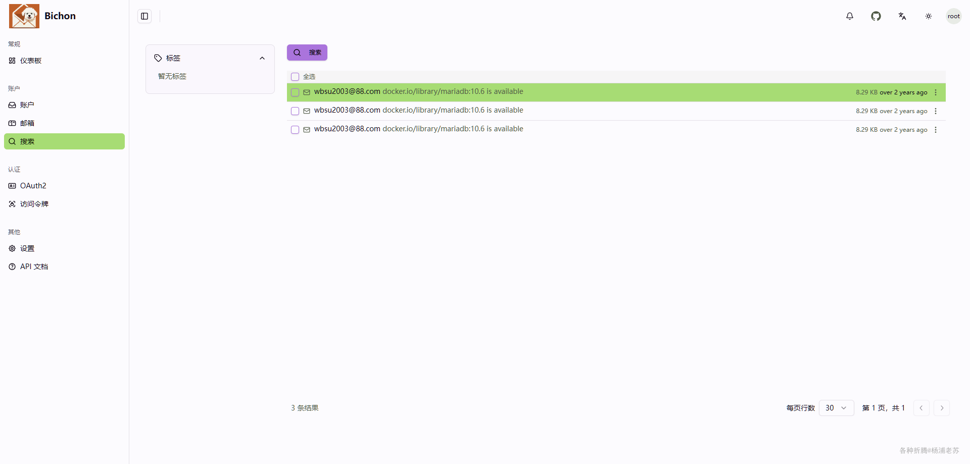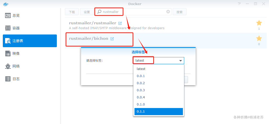 在注册表中搜索 rustmailer ,选择第二个 rustmailer/bichon,版本选择 latest