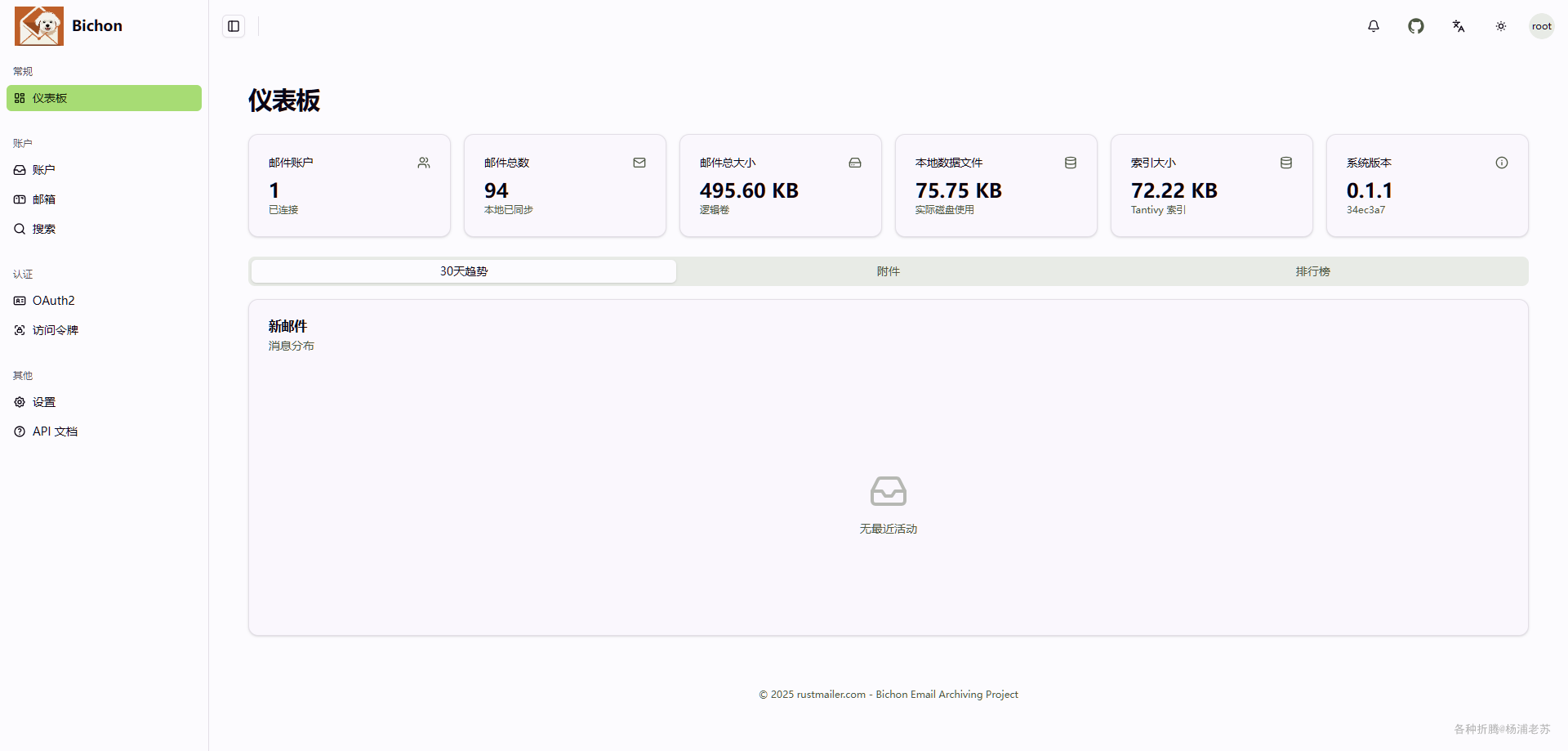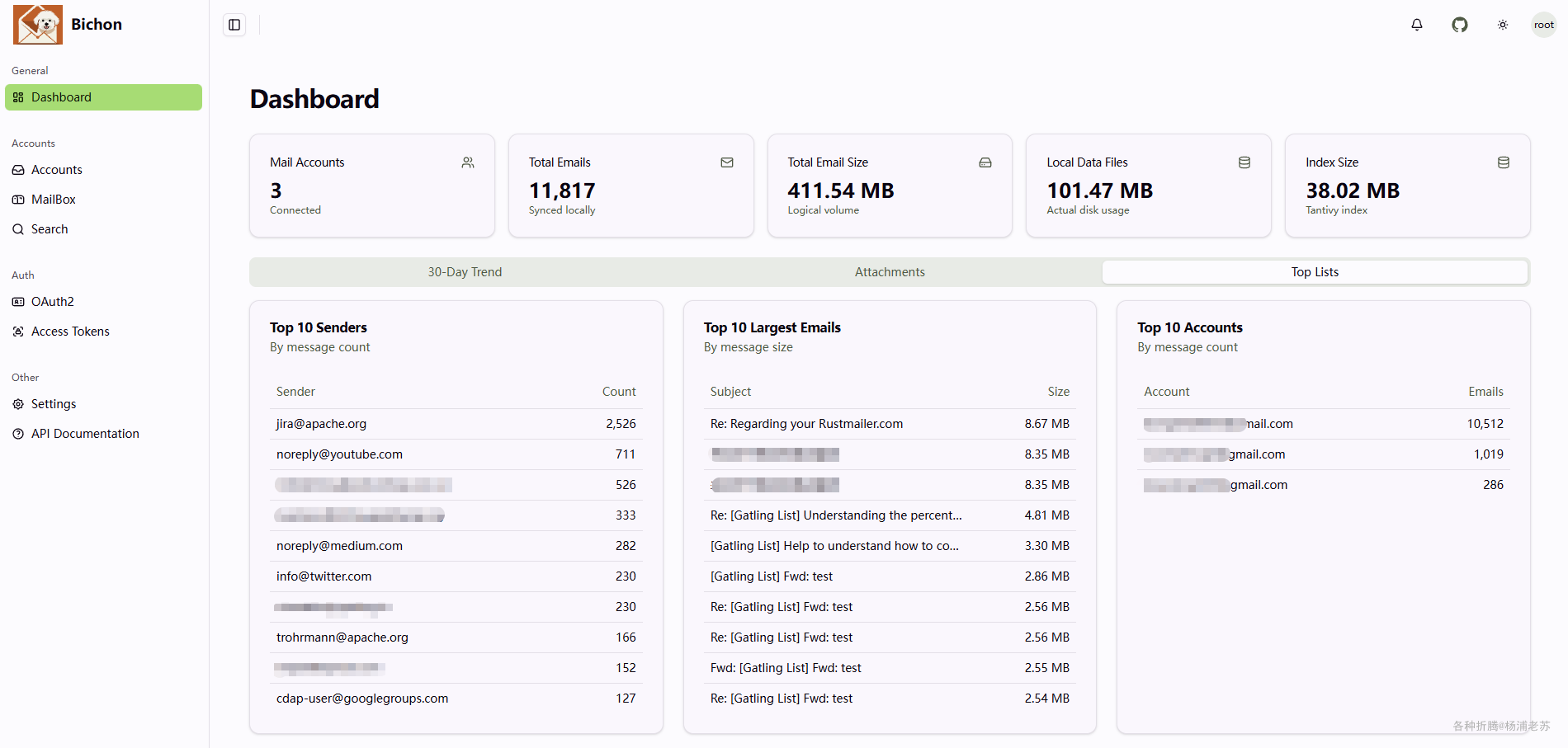 Bichon 是一个用 Rust 编写的轻量级、高性能的电子邮件归档系统,并提供了一个现代化的 WebUI。它的主要功能是从 IMAP 服务器同步您的电子邮件,为它们建立索引以实现快速的全文搜索,并提供一个 REST API 以便进行编程访问。不同于常规的邮件客户端,Bichon 专注于邮件的历史归档和搜索,而不是实时收发。它作为一个独立的服务器应用,可以持续同步您配置的邮件账户,并维护一个可搜索的本地副本。
