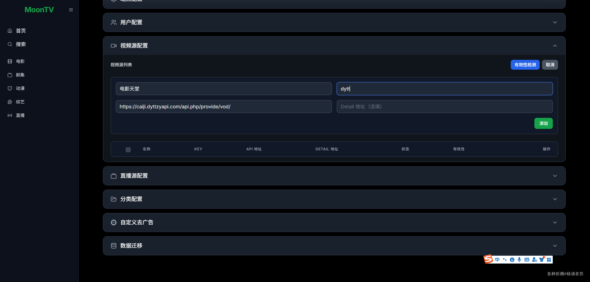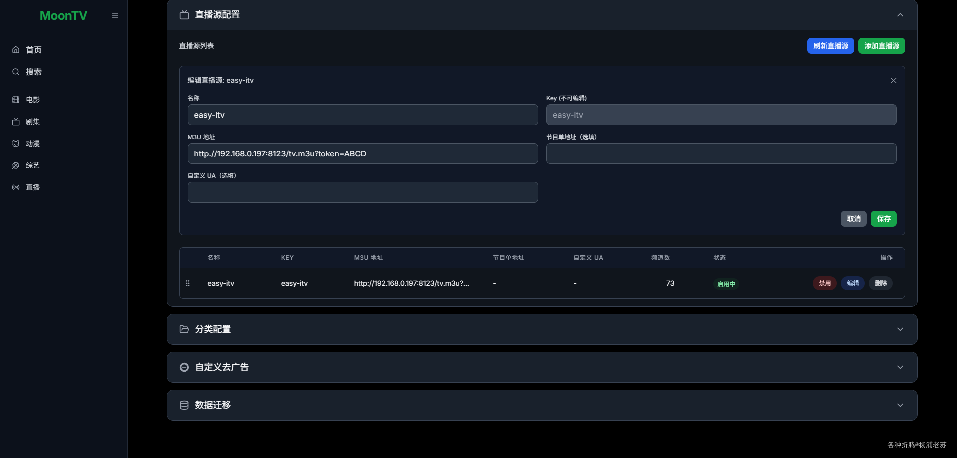 Key:唯一标识,保持小写字母/数字;M3U地址:直播源的地址,老苏用的是本地部署的easy-itv;