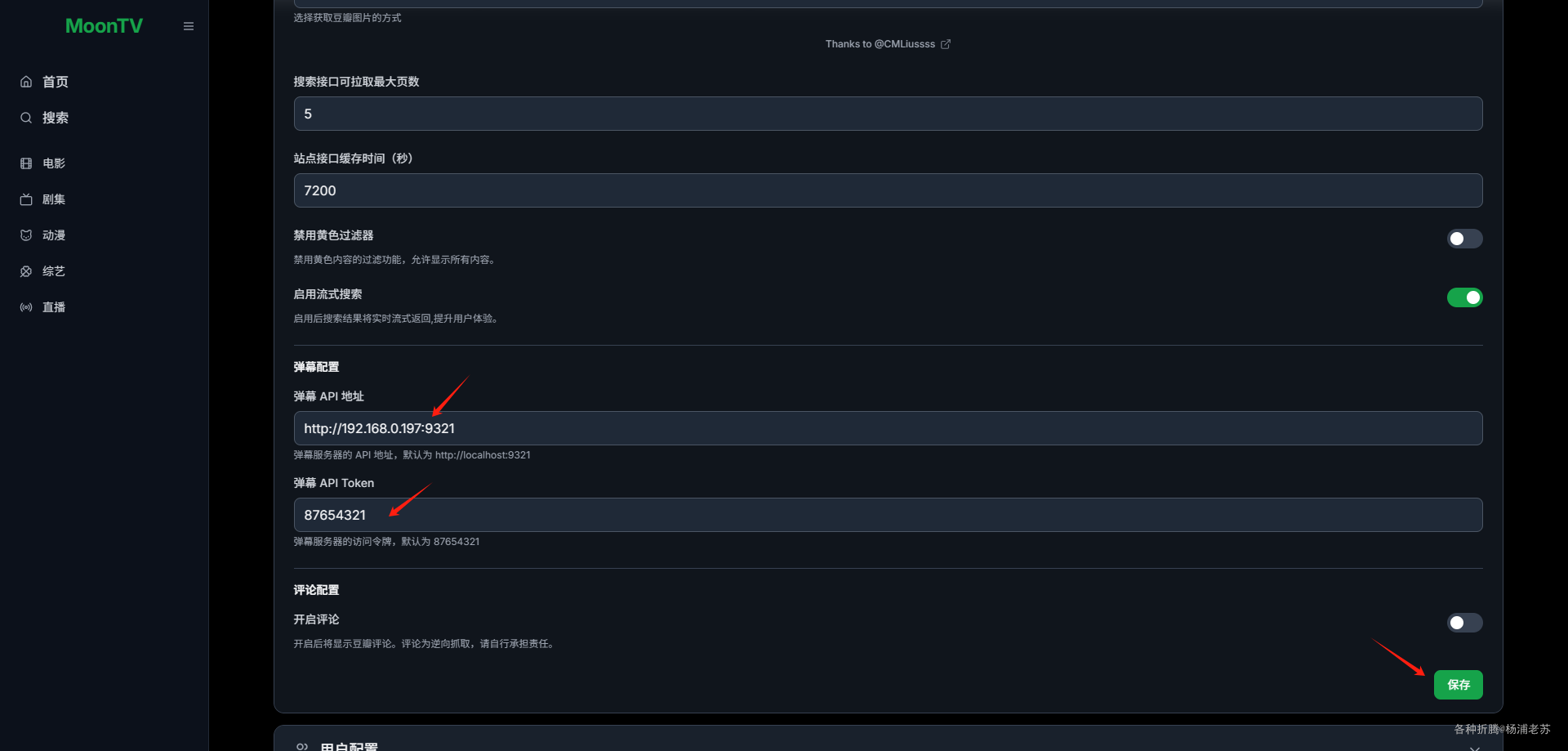 API地址:填入http://群晖IP:9321 - 弹幕