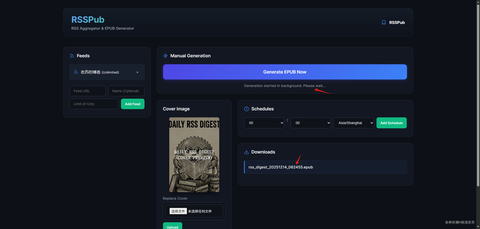 OPDS服务器(/opds),用户可以浏览并下载生成的EPUB文件。 - 调度功能:根据用户配置的
