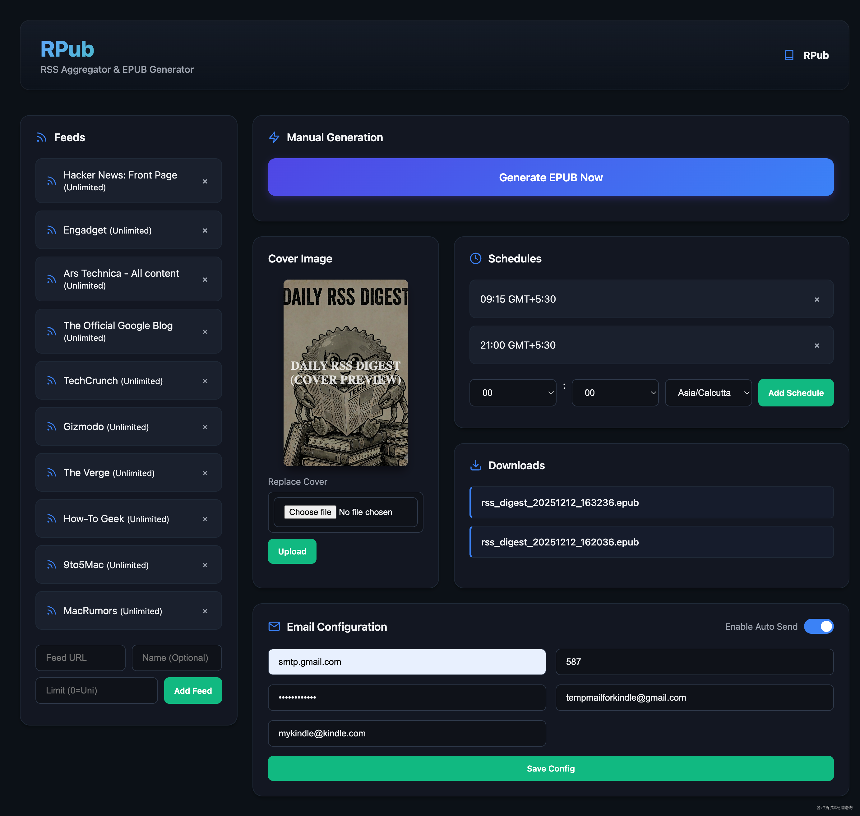 RSSPub是一个自托管的 Rust 应用程序,旨在将用户的RSS/Atom订阅源转换为个人化的每日新闻报(EPUB格式)。该工具自动抓取文章、处理图片,并将所有内容打包成可供e-reader或平板电脑阅读的EPUB文件。此外,RSSPub还提供了一个OPDS订阅源,使用户能够直接下载生成的EPUB文件到兼容的阅读器中,如KOReader和Moon+ Reader。