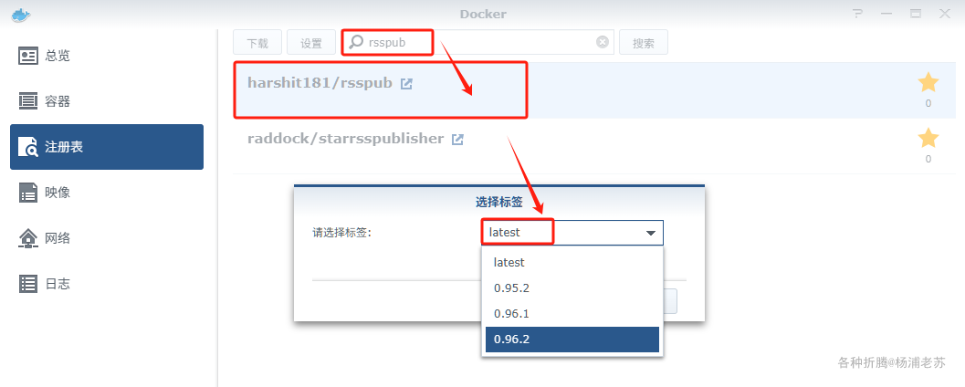 在注册表中搜索 rsspub ,选择第一个 harshit181/rsspub,版本选择 latest。