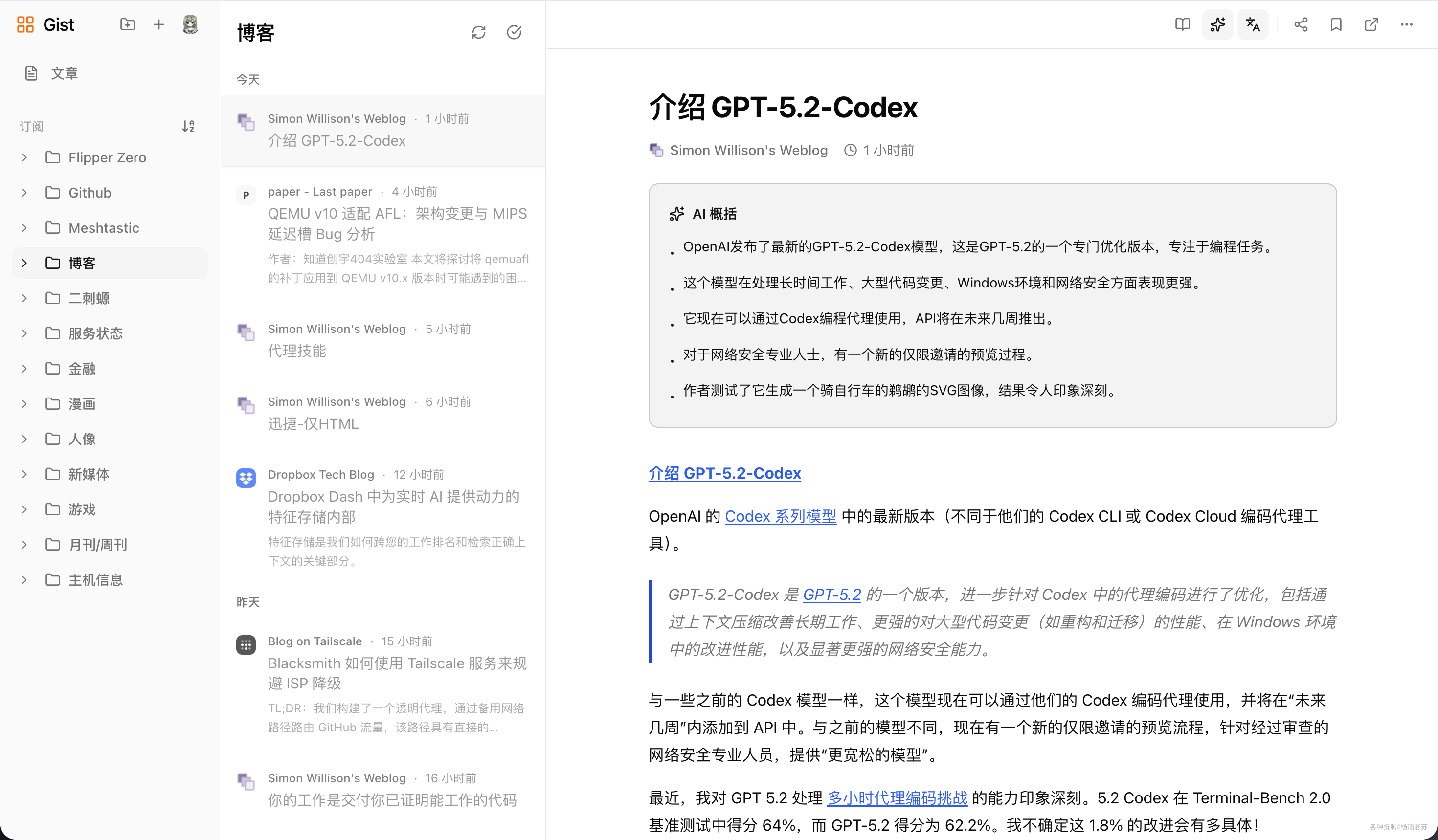 Gist 提供了一种方便、功能丰富的 RSS 阅读体验,结合 AI 技术和移动支持,为现代用户的内容消费需求,提供了高效解决方案。