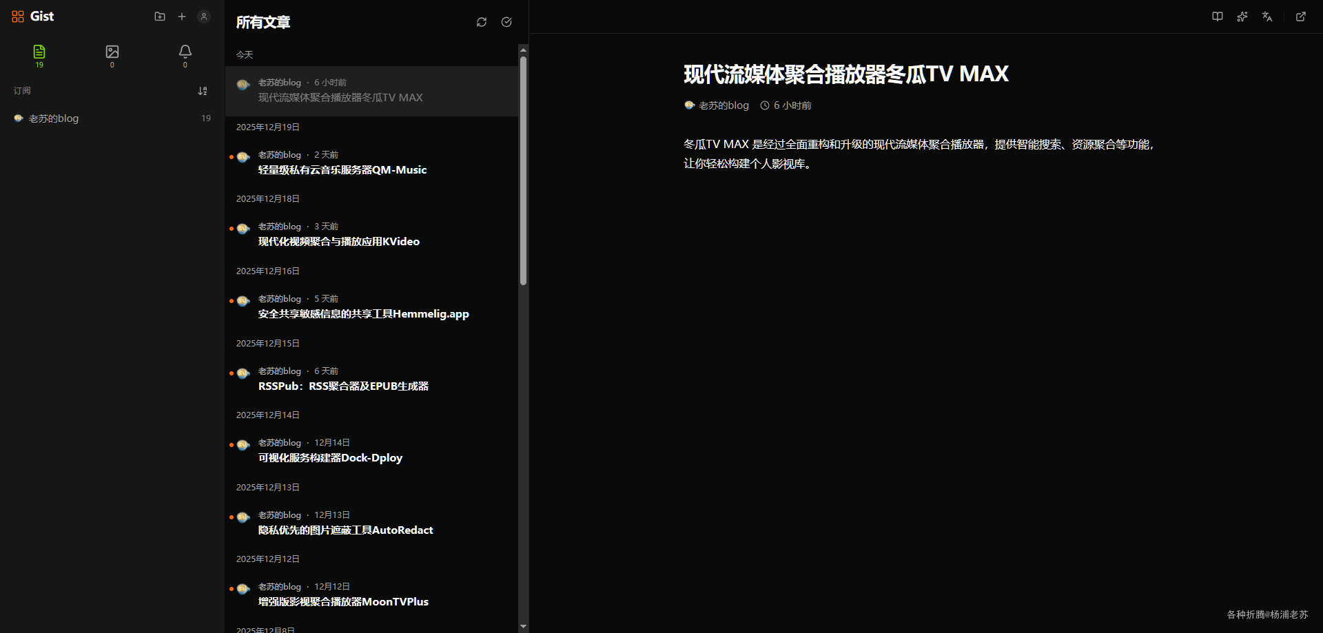Gist是一款专为专注而设计的极简、高性能RSS阅读器。使用现代Web技术构建,提供无缝的阅读体验。它的功能主要集中在导入导出RSS源、AI翻译与摘要、移动端和渐进式Web应用 (PWA) 的支持。