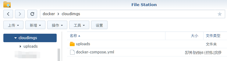 在 docker 文件夹中,创建一个新文件夹 cloudimgs,并在其中建一个子文件夹 uploads