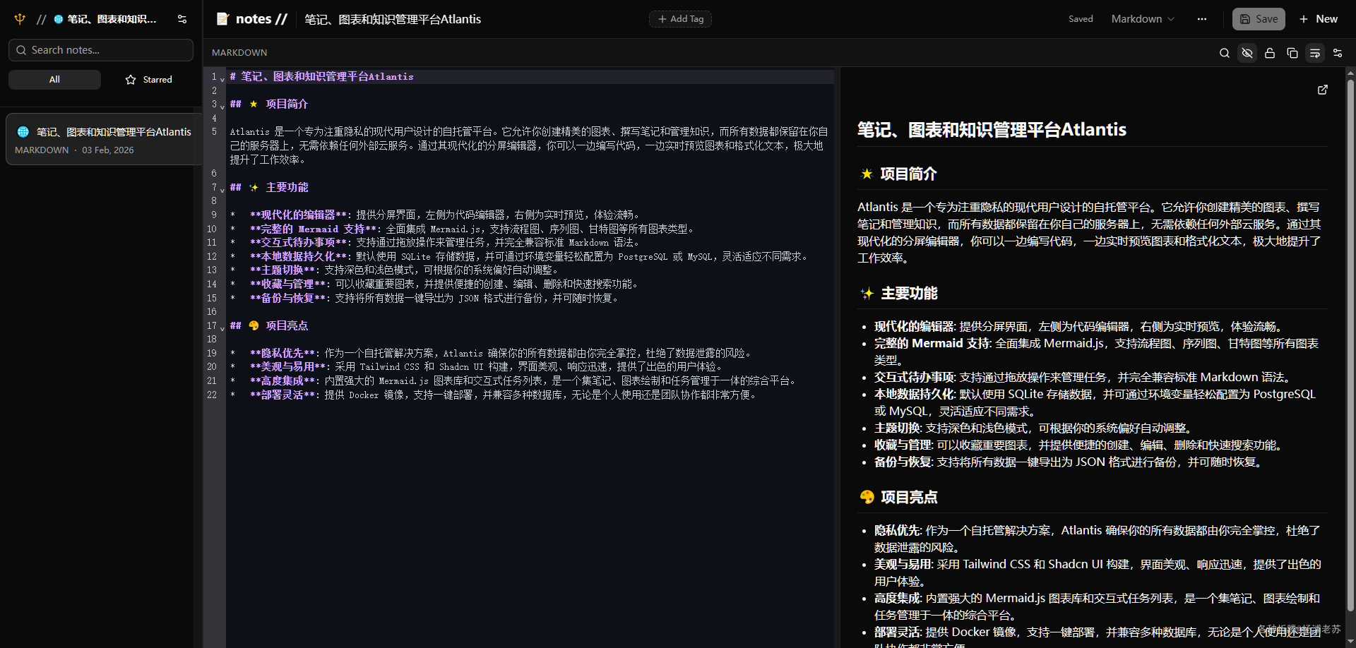 Atlantis是一个专为注重隐私的现代用户设计的自托管平台。它允许你创建精美的Mermaid.js图表、撰写笔记和管理知识,而所有数据都保留在你自己的服务器上,无需依赖任何外部云服务。通过其现代化的分屏编辑器,你可以一边编写代码,一边实时预览图表和格式化文本,极大地提升了工作效率。