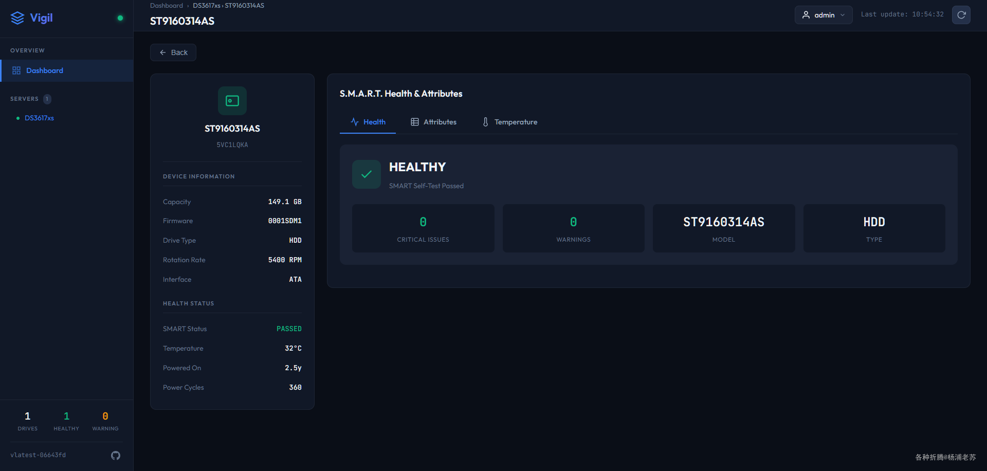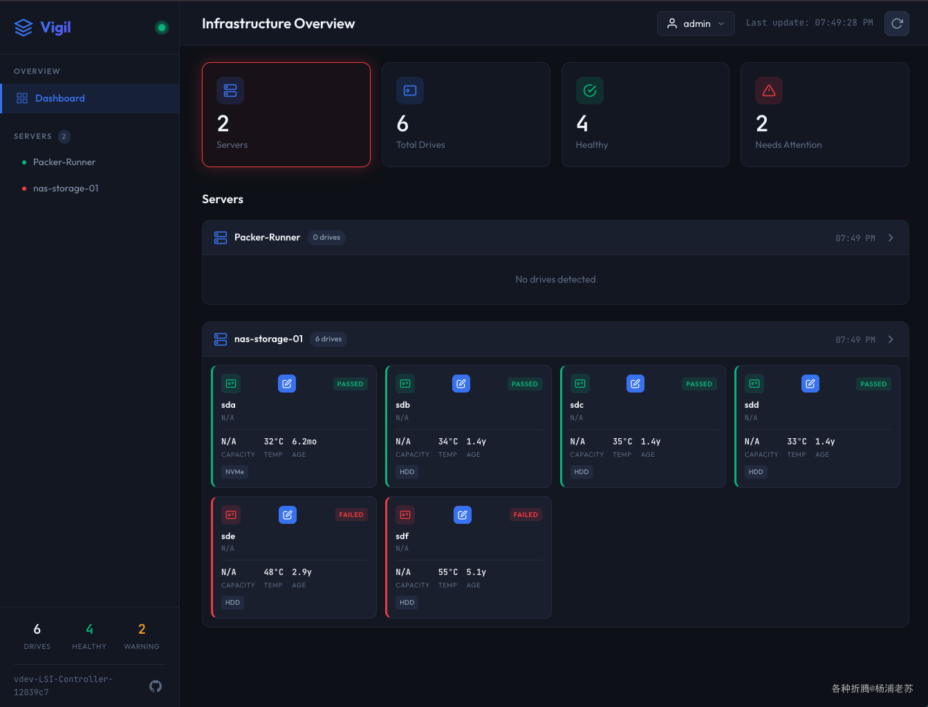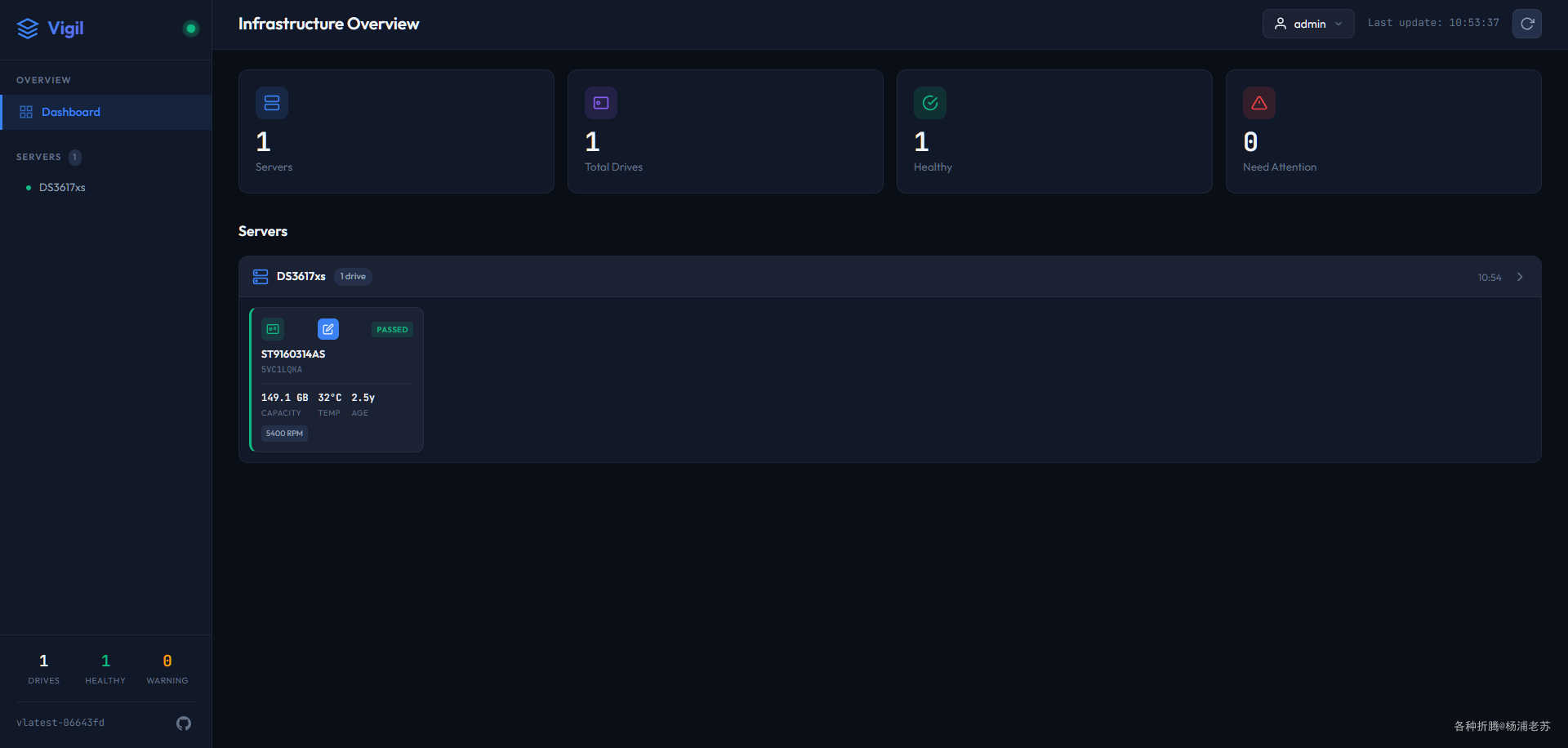 Vigil 是一个现代、轻量级、开源的服务器监控系统,提供对硬盘和 SSD 的实时 S.M.A.R.T. 健康状况跟踪。它为速度和简单性而设计,通过现代化的 Web 仪表盘和预测性健康分析提供对基础设施的即时可见性,以防止硬件故障。它适用于任何 Linux 系统,包括那些配备了 LSI/Broadcom HBA 控制器的系统。