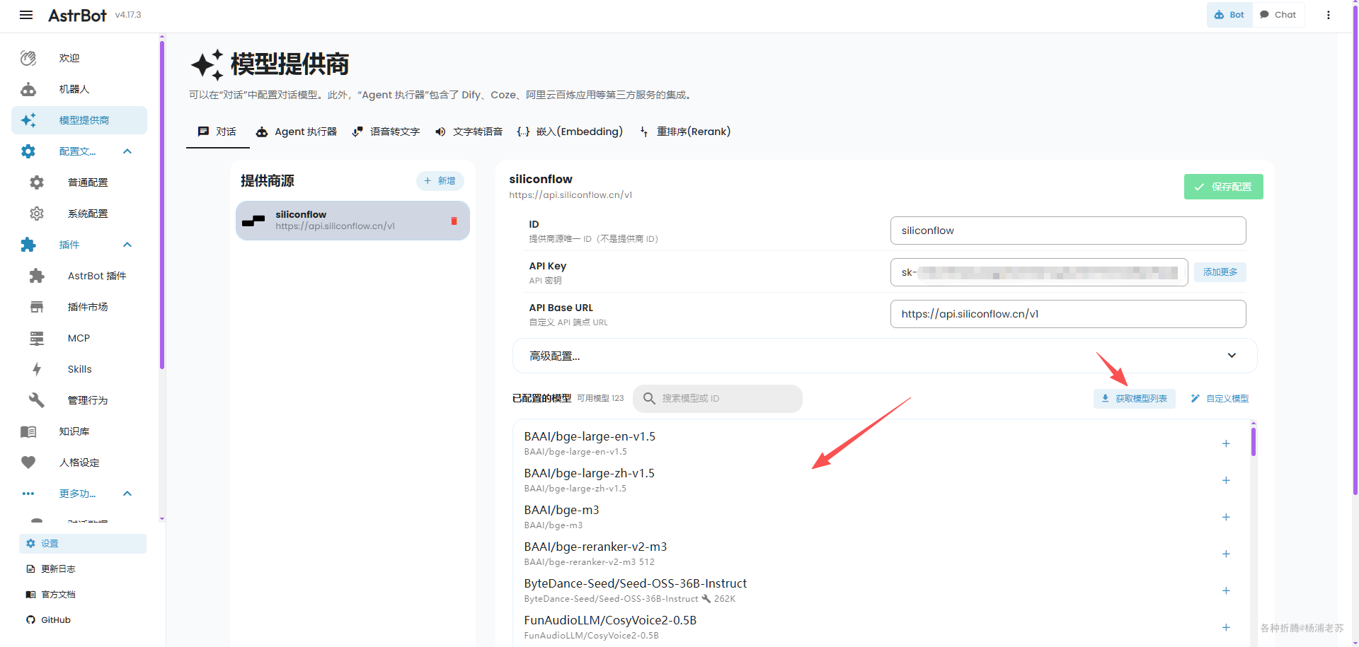 如果 Key 没问题,点 获取模型列表 会显示可用的模型