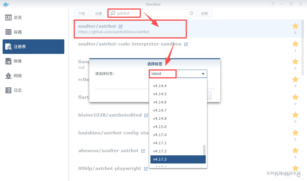 在注册表中搜索 astrbot ,选择 soulter/astrbot,版本选择 latest