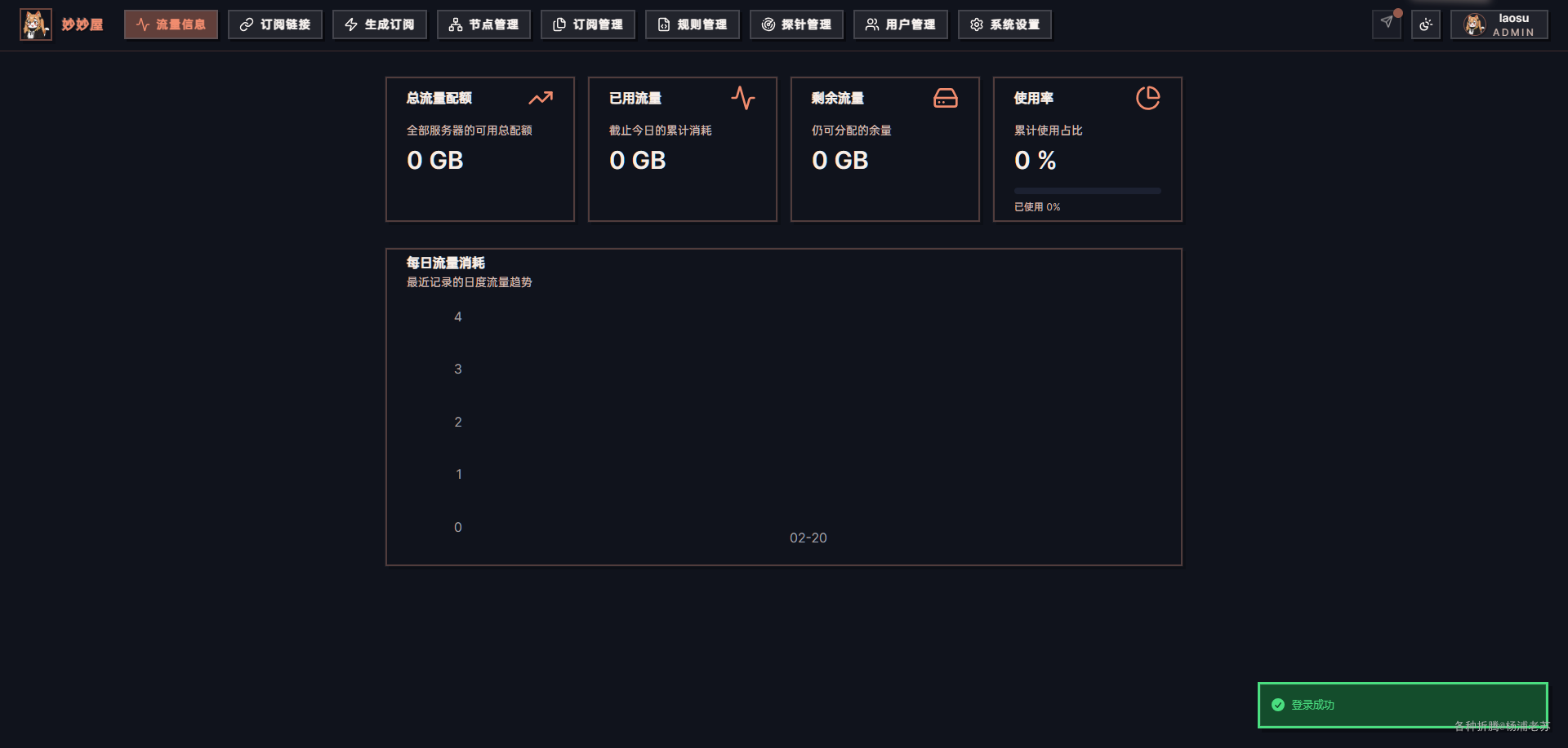 MiaoMiaoWu 主要用于个人或小型团队管理 Clash 订阅,包括节点管理、自定义订阅生成、流量监控以及用户权限管理,方便用户更灵活地控制和使用 Clash 代理服务。