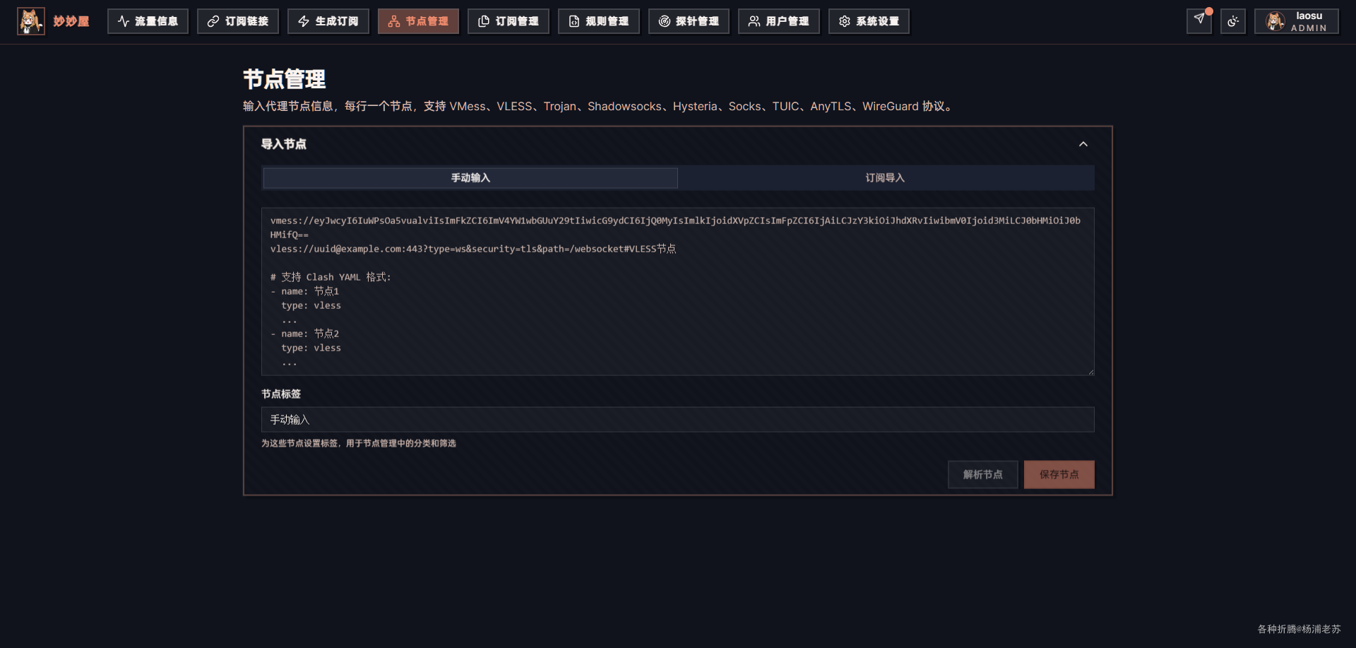 MiaoMiaoWu(妙妙屋) 是一个轻量级、易部署的Clash订阅管理系统,支持节点管理、生成订阅、导入外部订阅节点等功能。它还支持Nezha、DStatus和Komari探针来获取流量信息。从而提升用户在使用Clash时的便利性。