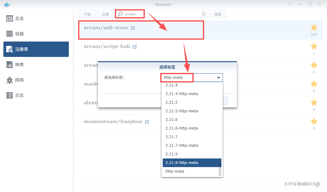 在注册表中搜索 xream ,选择 xream/sub-store,版本选择带 http-meta 的镜像,可直接使用需要 HTTP-META 功能的脚本,例如 节点测活 等