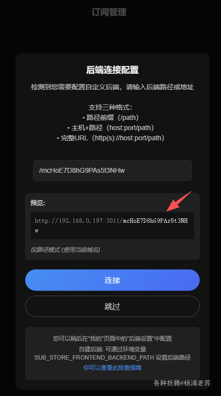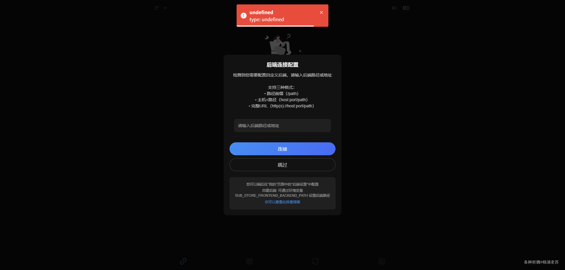 首次使用时,需要在 后端设置 页面填入你的后端地址,格式为:http://群晖IP:3011/mcHoE7D8hG9PAs5t3NHw (请确保路径与环境变量 SUB_STORE_FRONTEND_BACKEND_PATH 的值一致)。