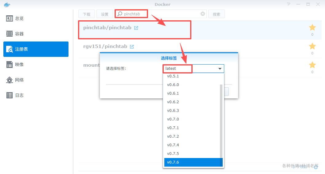 在注册表中搜索 pinchtab ,选择第一个 pinchtab/pinchtab,版本选择 latest。