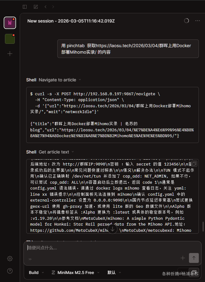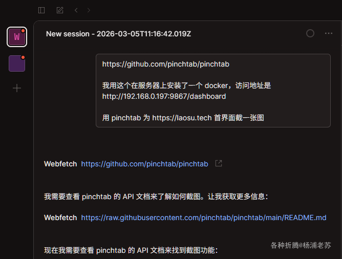 界面不是重点,因为 PinchTab 支持 CLI 命令,而且后面我们都是在 AI 中操作,执行的是类似下面👇这样的命令