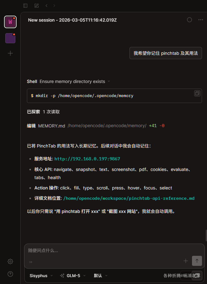 让 OpenCode 记住了这个软件,以后再想调用就简单了,只要说 “用 pinchtab 打开 xxx” 或 “截图 xxx 网站” 就行