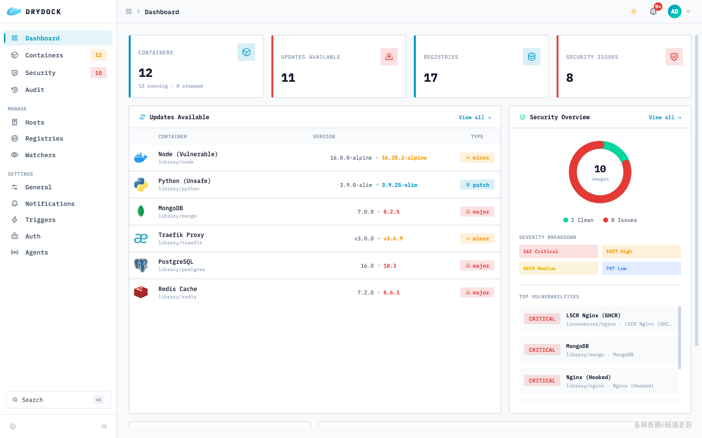 Drydock是一款开源的容器更新监控工具,使用TypeScript构建,现代化UI设计。它可以自动发现运行的容器,检测23个镜像仓库的更新,并通过20+种渠道发送通知。与Watchtower、Ouroboros等传统工具不同,Drydock提供了完整的Web管理界面和丰富的企业级功能。
