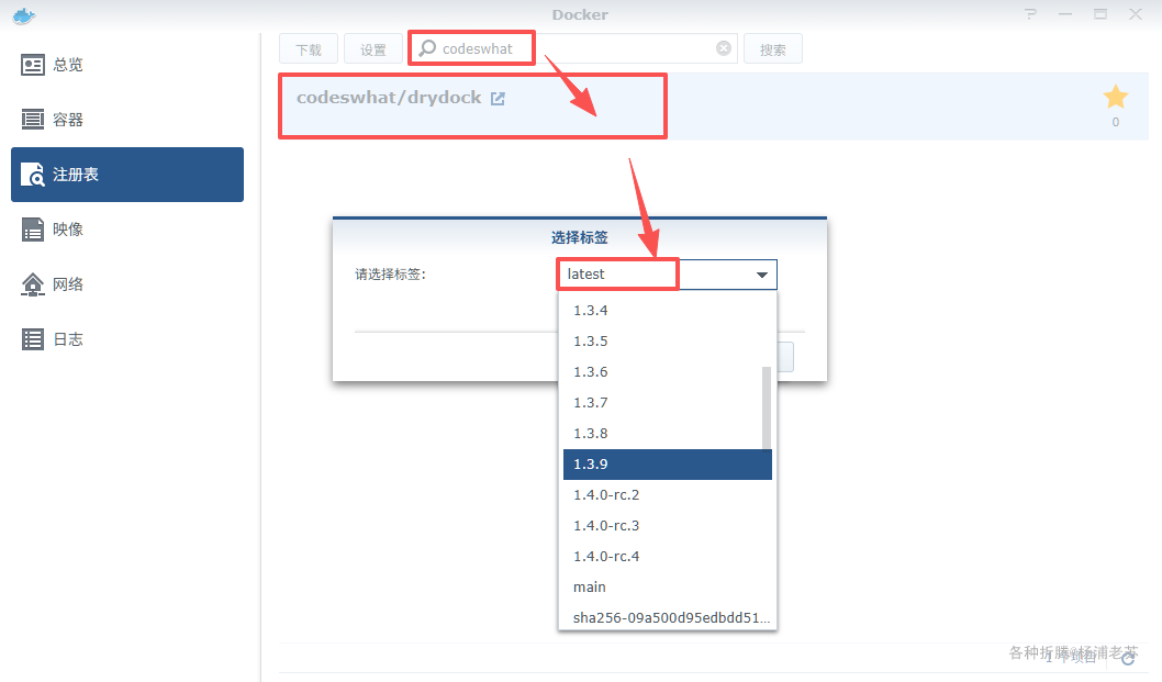 在注册表中搜索 codeswhat ,选择第一个 codeswhat/drydock,版本选择 latest。