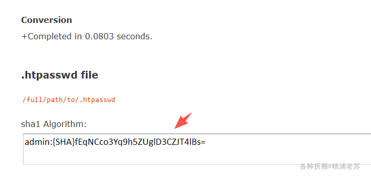 生成的格式类似 admin:{SHA}fEqNCco3Yq9h5ZUglD3CZJT4lBs=