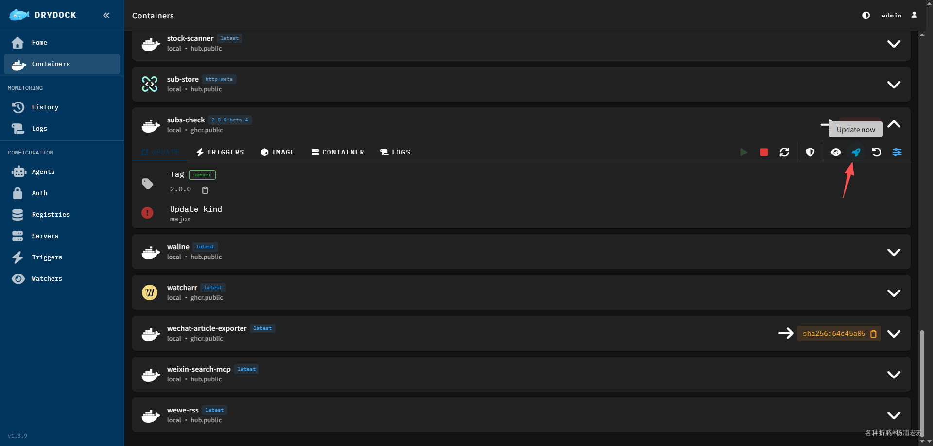 选择需要升级的容器,点 Update now
