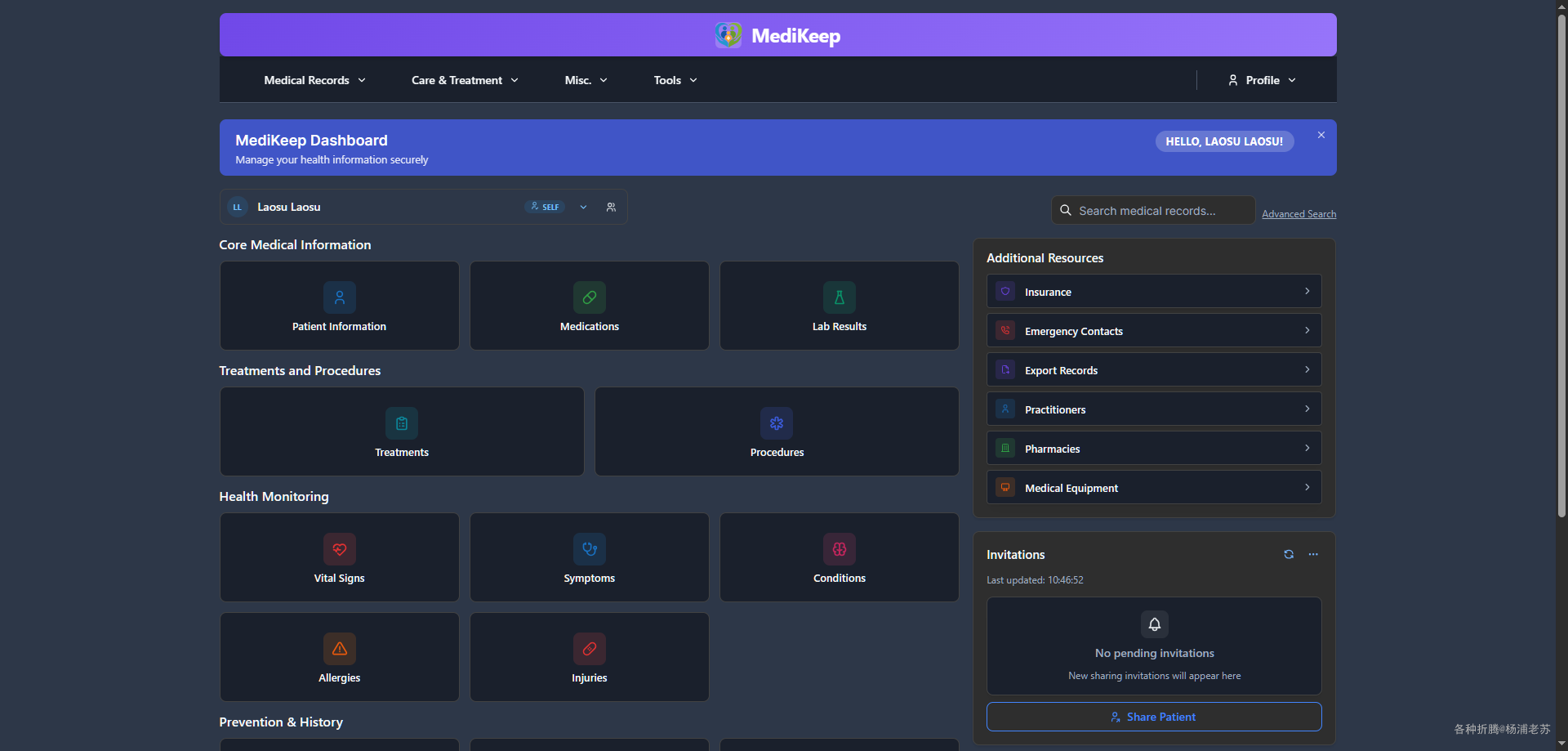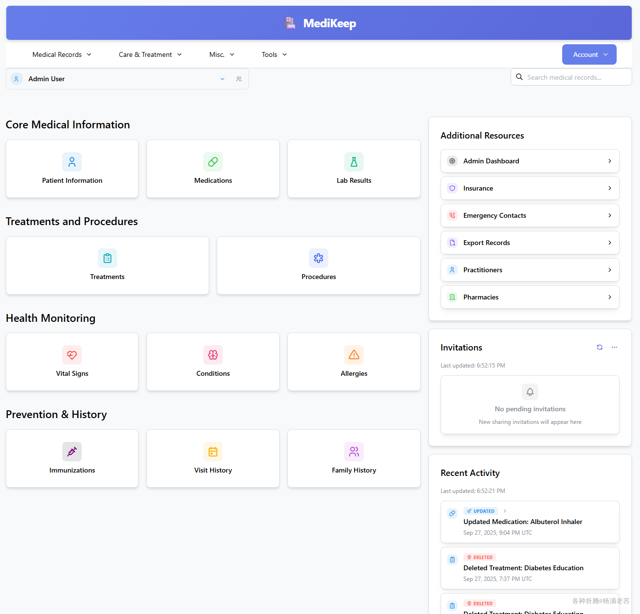 MediKeep 是一个开源的个人健康档案管理工具,基于 React 前端和 FastAPI 后端构建。它可以帮助用户集中管理个人医疗记录、追踪用药情况、生成健康报告,并与医疗机构共享数据。