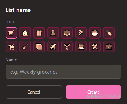 16 MB磁盘占用,~2.5 MB内存占用 - 多清单:支持创建多个购物清单(如不同超市、不同用途),可自定义图标