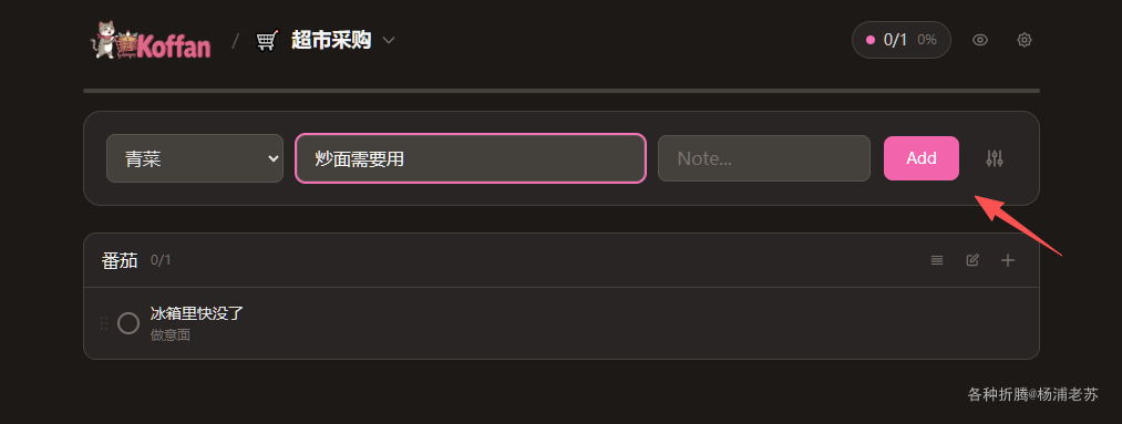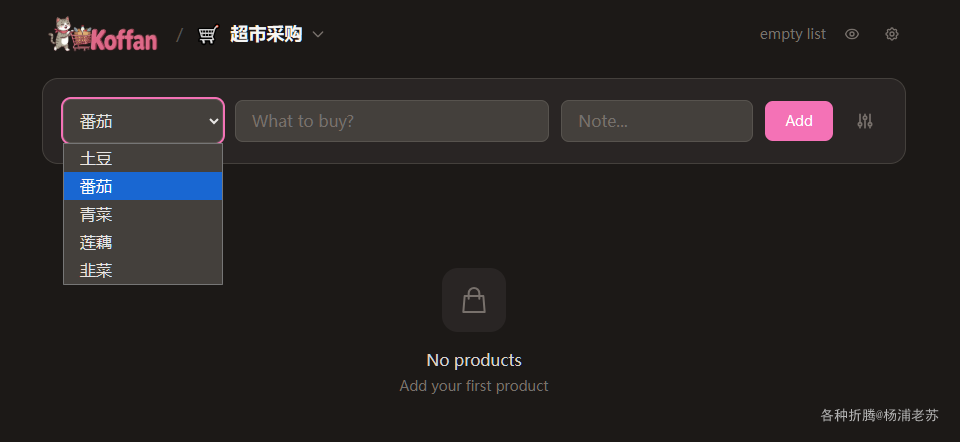 Koffan是一个免费的开源购物清单应用,专为家庭和情侣设计。它允许多个设备之间实时同步,让多人实时共享同一个购物清单,让每个人都知道该买什么,购物车里已经有哪些。解决了「谁去买」「买了没」「还要买什么」的家庭协作难题。