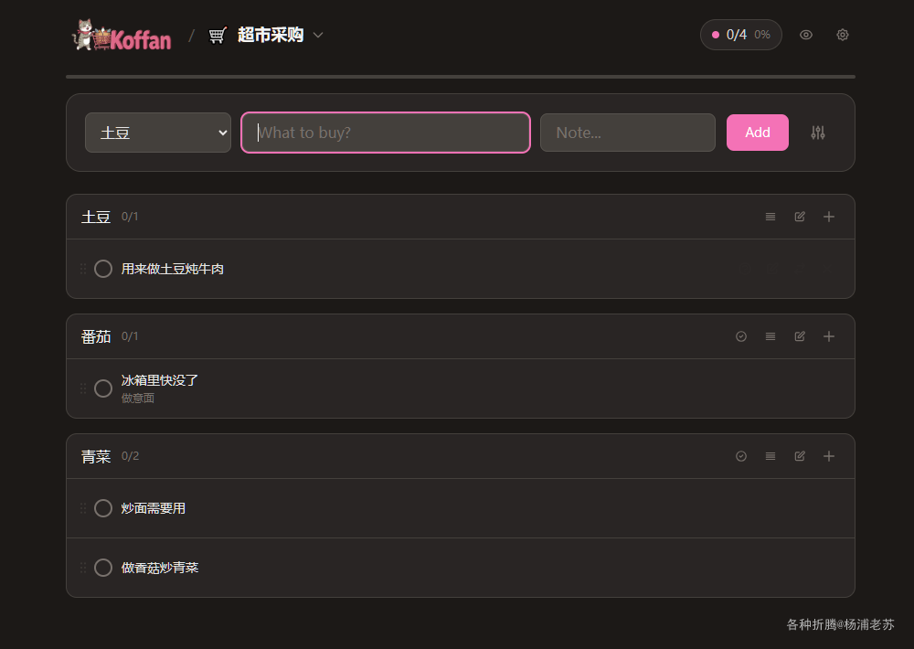 Koffan 是一个简单好用的家庭购物协作工具,特别适合不想安装复杂应用只想快速分享清单的用户。