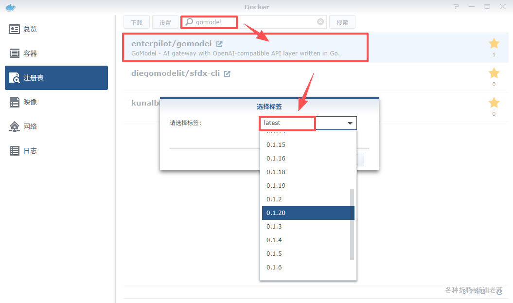 在注册表中搜索 gomodel,选择第一个 enterpilot/gomodel,版本选择 latest