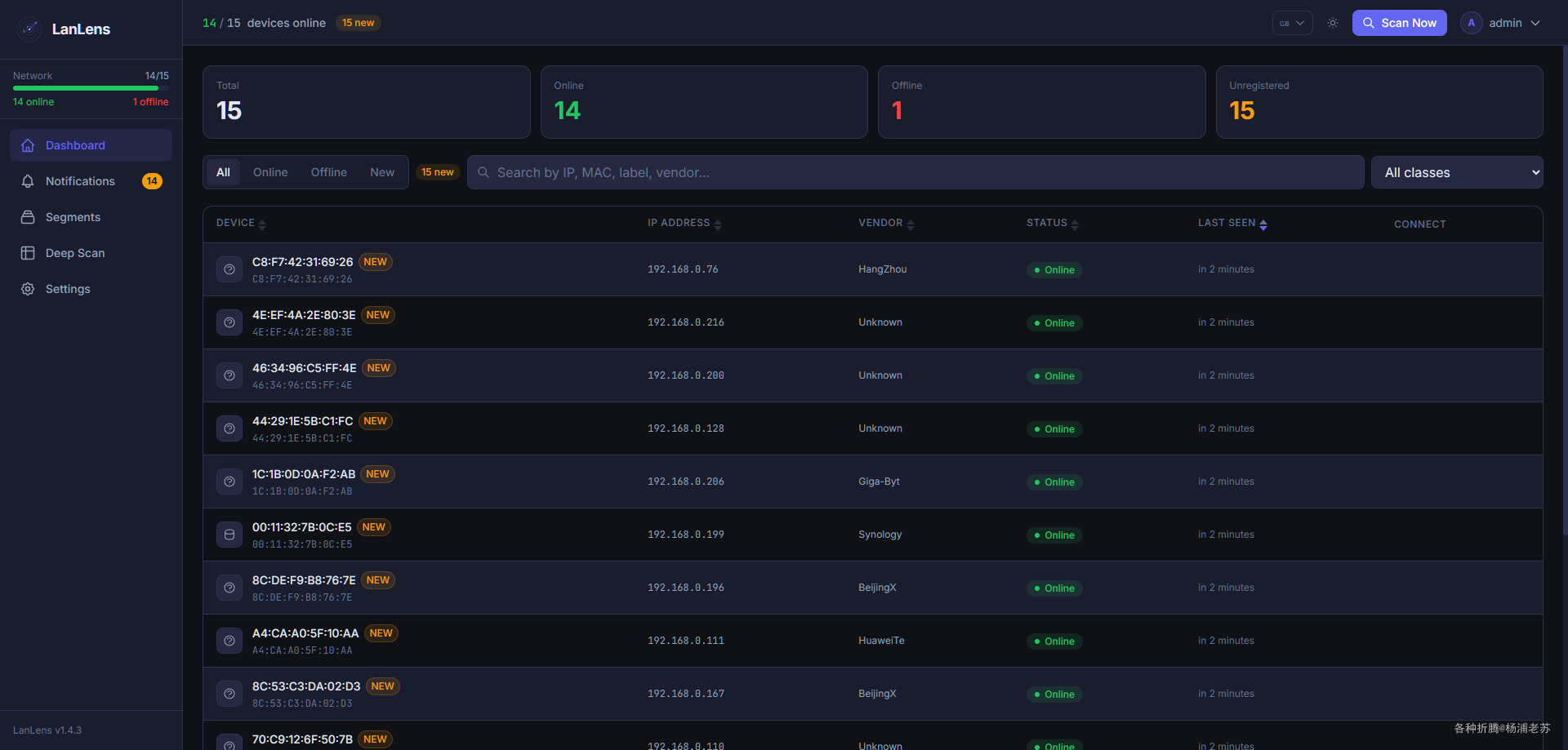 LanLens是一个开源的自托管网络监控和文档仪表盘,它能够持续扫描本地网络,通过MAC/IP地址识别每台设备,并提供一个简洁的深色主题Web界面,让用户可以管理、文档化和连接网络中的所有设备。