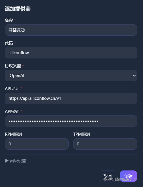 OpenAI就行 API地址:硅基的地址是https://api.siliconflow.cn/v1API密钥:填入硅基的秘钥RPM(Requests Per Minute):指每分钟请求数TPM(Tokens Per Minute) :指每分钟Token数