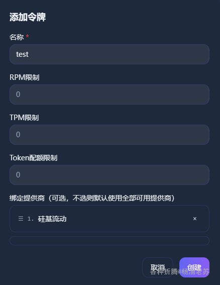 RPM限制:0就是无限制TPM限制:0就是无限制Token配额限制:0就是无限制- 绑定提供商:就我们前面添加的