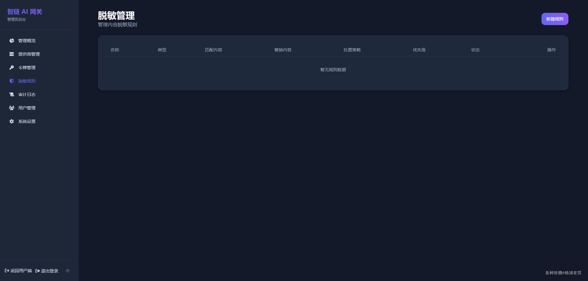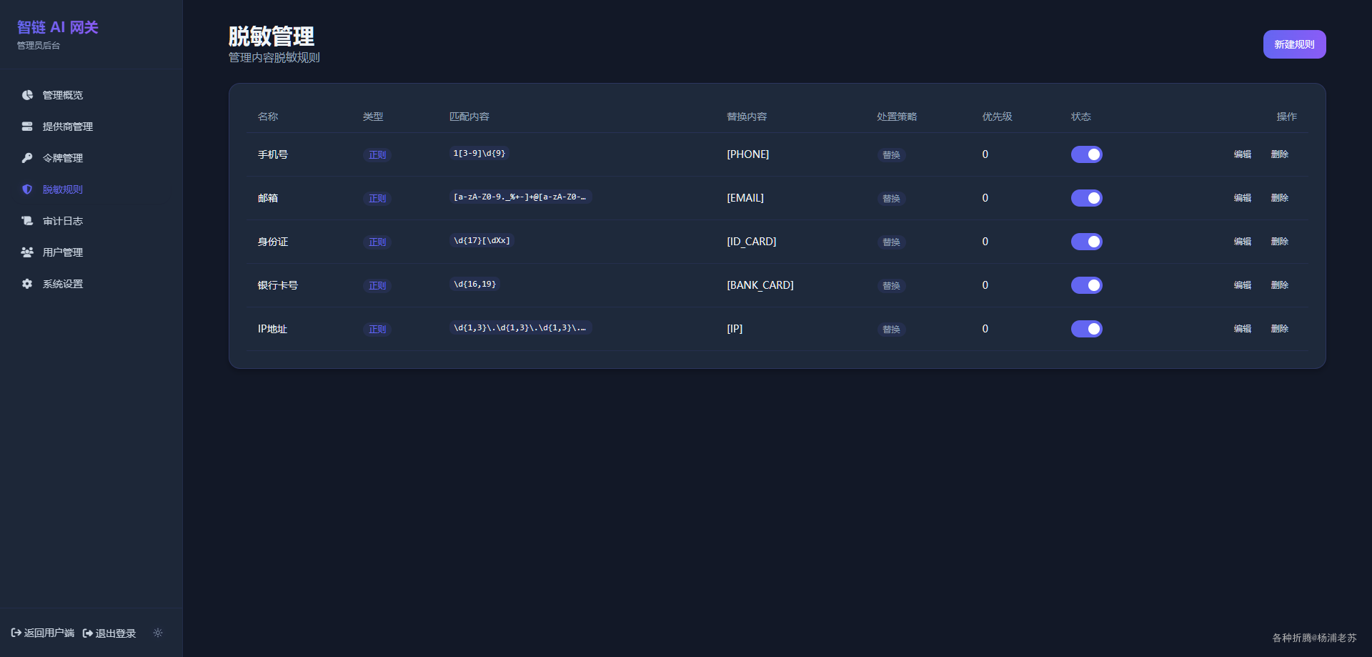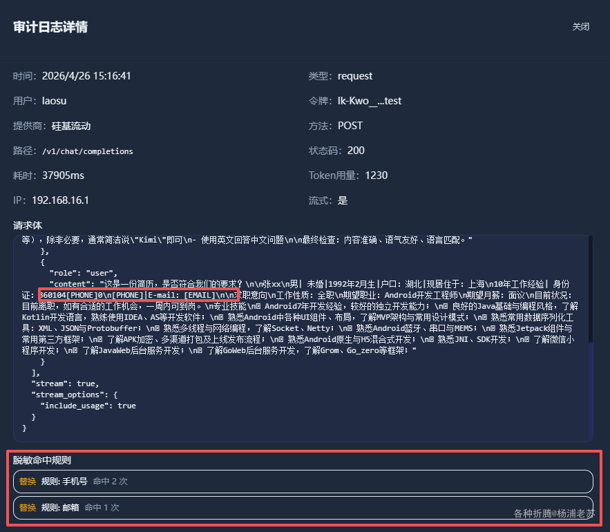 - 双层脱敏引擎:管理员全局强制脱敏 + 用户自定义规则,关键字/正则匹配,敏感数据在请求发出前自动替换,绝不会到达上游提供商