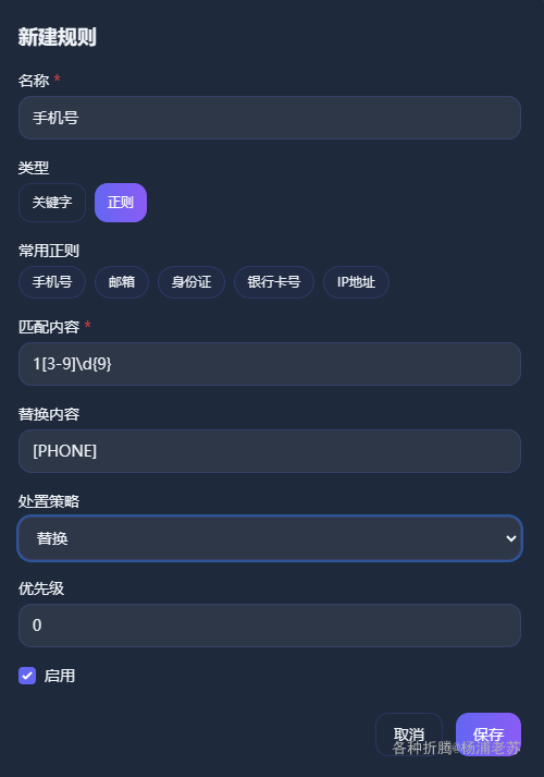 通过新建规则,可以对手机号、邮箱、身份证、银行卡号、IP地址等进行替换操作