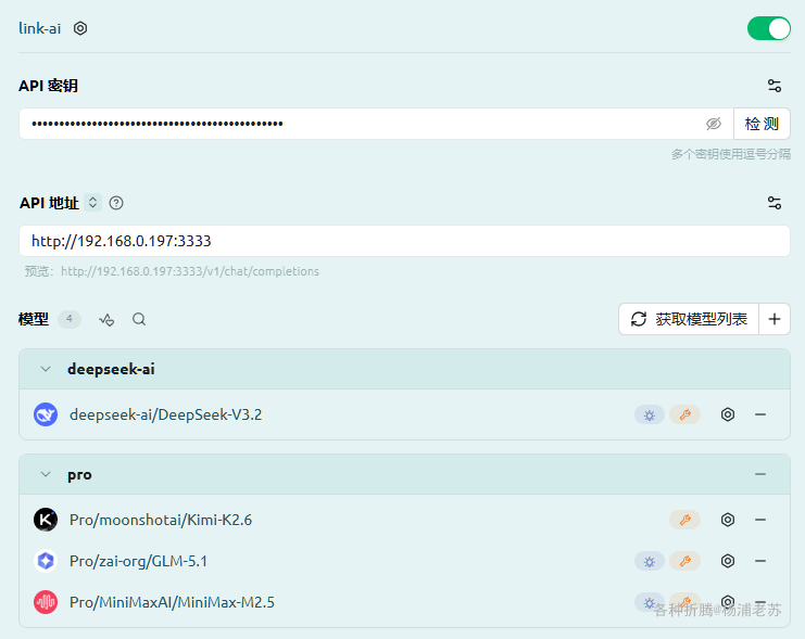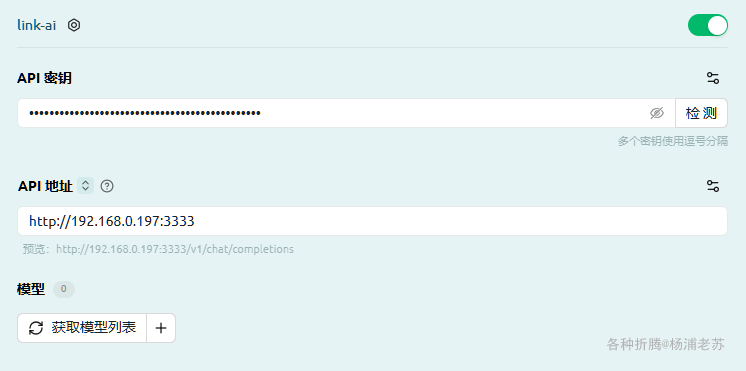 API密钥:就是我们前面创建的令牌API地址:就是link-ai的地址,填入http://<群晖IP>:3333