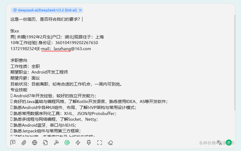 网上找了一段简历进行测试,里面包含了编造的邮件、手机和身份证的信息