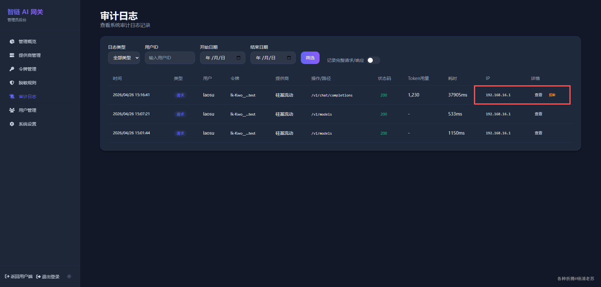 - 链式哈希审计日志:每条审计日志通过哈希链关联,防篡改防删除,完整记录请求/响应,满足合规审查需求