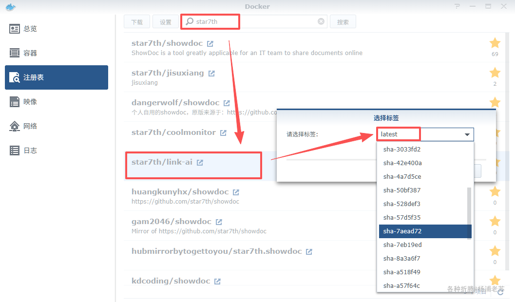 在注册表中搜索 link-ai,选择第五个 star7th/link-ai,版本选择 latest。